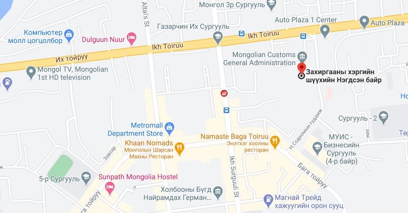 Хаяг: Монгол Улс, Улаанбаатар хот, Сүхбаатар дүүрэг, 8 дугаар хороо, Их тойруу 81/1, Нийслэл дэх Захиргааны хэргийн анхан шатны шүүхийн байр