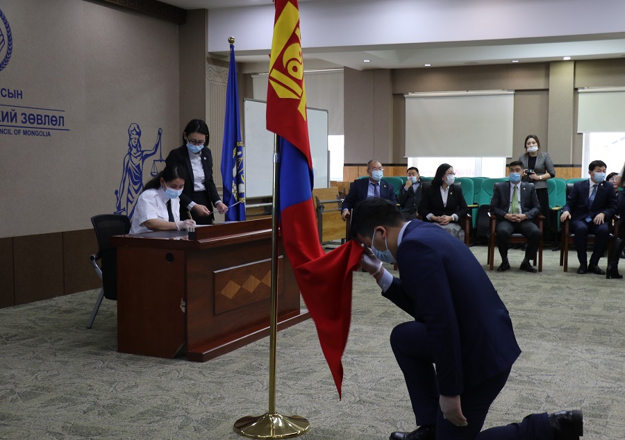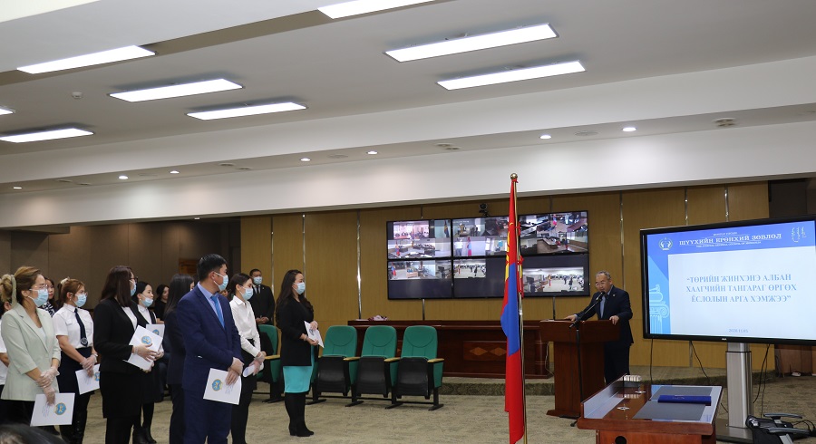 Төрийн жинхэнэ албан хаагчийн тангараг өргөх ёслолын ажиллагаа өнөөдөр Шүүхийн ерөнхий зөвлөлийн байранд боллоо. Энэхүү ёслолд Шүүхийн ерөнхий зөвлөлийн дарга Э.Батбаяр, гишүүн Л.Атарцэцэг, Д.Цогтсайхан, Гүйцэтгэх нарийн бичгийн дарга О.Амгаланбаатар, Төрийн албаны зөвлөлийн Шүүхийн ерөнхий зөвлөлийн дэргэдэх салбар зөвлөлийн дарга Ш.Отгонцэцэг, гишүүн Б.Биндэрьяа, Н.Ганбаатар болон ажлын албаны нэгжийн удирдлагууд, Нийслэл дэх анхан болон давж заалдах шатны шүүхийн захиргааны ажилтнууд оролцсон бөгөөд орон нутгийн шүүхүүдтэй онлайнаар холбогдсон юм.