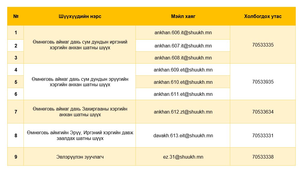 Та бүхэн шүүхийн Тамгын газрын үйл ажиллагааны талаар болон бусад асуудлаар энэхүү цахим хуудасны холбоо барих цэсийн цахим шуудангаар болон 70532946, 70533631 дугаарын утсаар холбоо барих боломжтой.